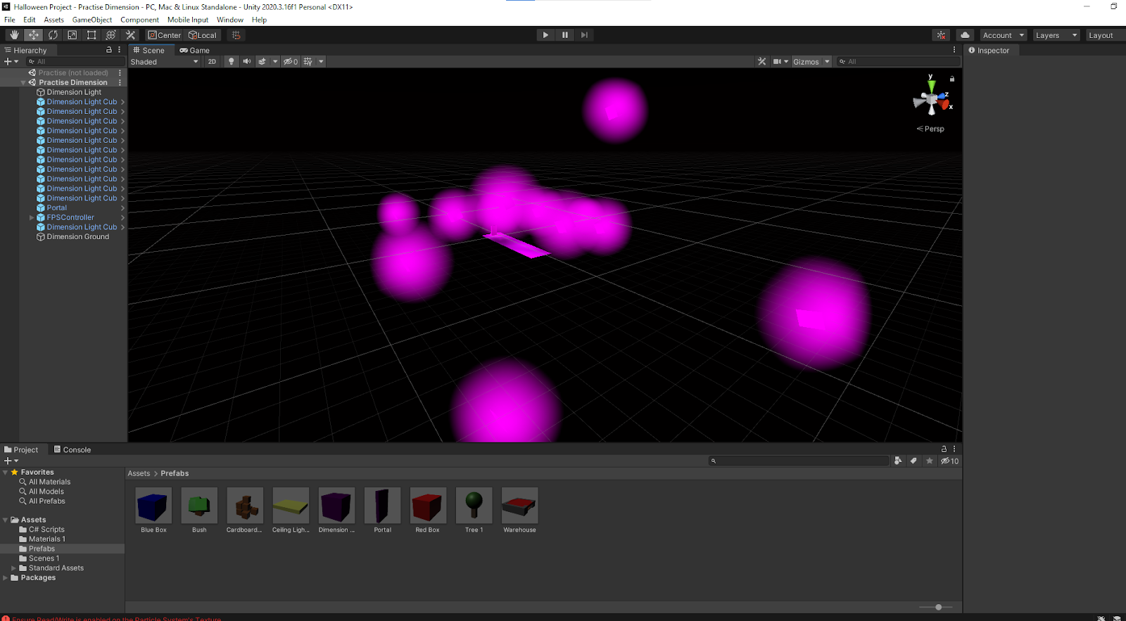 I have managed to create a change scene trigger and applied it to a portal that also has a particle system component applied and is a light source. The portal itself was created using the scale tool and with an applied purple texture to give the shape and color, then I used Unity's particle system to make it emit particles that are purple in color and create intrigue for the player, I also applied a point light that is purple colored as well to increase the intrigue and make it stand out in the warehouse.